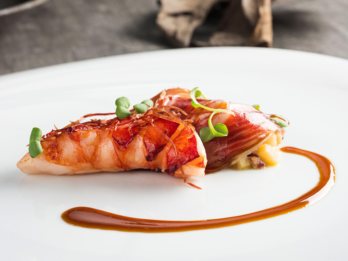 还有一道蓝龙虾也是主厨的绝活,法国布列塔尼出产的蓝龙虾肉质肥厚、鲜嫩,搭配来自西班牙48个月的小荷赛火腿,带来陆地食材与海洋食材的惊喜碰撞。