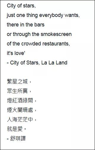 留言中还出现了不少英文诗句、歌词的中文翻译,有人认为“翻译靓过原文,中文方块字先做到对称均衡,有建筑美。中文一字一音节,更容易做到节奏均衡,有音乐美。”