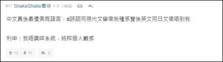 这条帖子引起了“连登仔”们的热烈讨论。不少人拿中文歌词、诗词举例,对楼主的观点表示赞同,有人则直接留言表白:“我爱中文!”“中文真的好靓!”