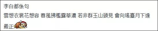 除了字词外,留言中更是出现了不少已经优美的诗句。有人在留言中称,自己读完了莎士比亚,还是觉得李白最强,并祭出了李白的“举杯邀明月、对影成三人”。有人还吟起了《清平调》:云想衣裳花想容,春风拂槛露华浓。若非群玉山头见,会向瑶台月下逢。