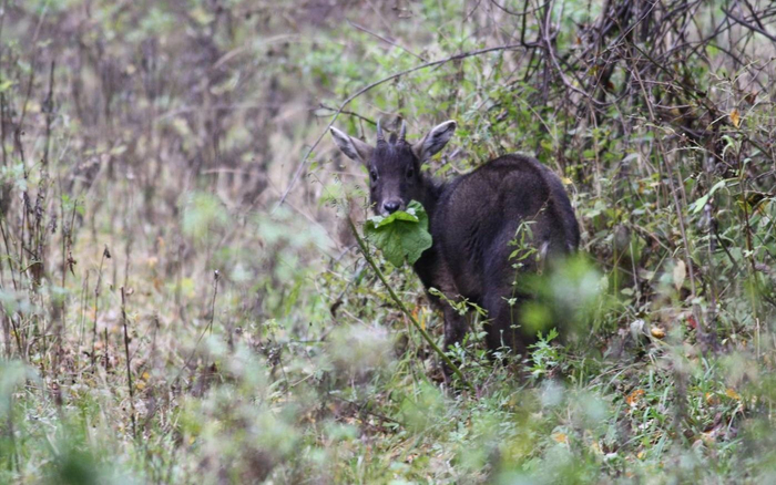 2017年5月,在黄柏塬自然保护区大南沟抓拍到的觅食中的斑羚。受访者供图