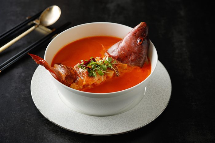李强推荐的两道菜分别是浓汤过桥东星斑、原只鲍鱼鸡粒酥。海鲜是粤菜非常重要的食材之一,调味饱满的浓汤过桥东星斑,鱼肉细腻香甜,一口浓汤,一口鱼肉,在寒冬里令人心暖。原只鲍鱼鸡粒酥软嫩香滑,入口酥脆的蛋挞底加上整粒鲍鱼,搭配咸香鸡粒,最后淋上鲍鱼汁,回味无穷。
