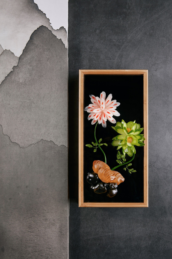如果你第一次来,杨伟杰会建议你先试试这里的招牌必点开胃菜——富春青花图。菜如其名,这款菜的灵感来自《富春山居图》,造型清雅,如同画卷,美妙之处更在于画卷中每一处“风景”皆可食用,口感丰富清爽。