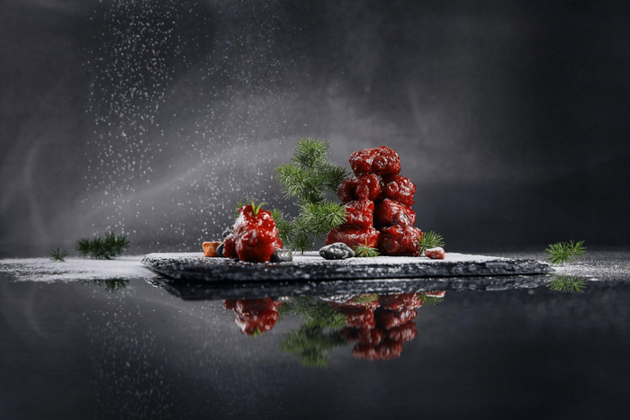 另外推荐鲟龙鱼籽片皮鸭,西餐鲟鱼子酱搭配北京烤鸭,完美跨界。鱼籽鲜美、烤鸭皮香酥、鸭肉香嫩,配上青瓜清爽解腻。火山盐烧澳洲和牛也是很多老食客的最爱,将五至七成熟的澳洲和牛肉粒放置于玫瑰岩盐板上,煎烤后十分诱人,表皮焦香,内里鲜嫩多汁。冬季不能不点“霜露降红石”,这道菜宛如雪后园景,却是人气最高的一道排骨菜肴。