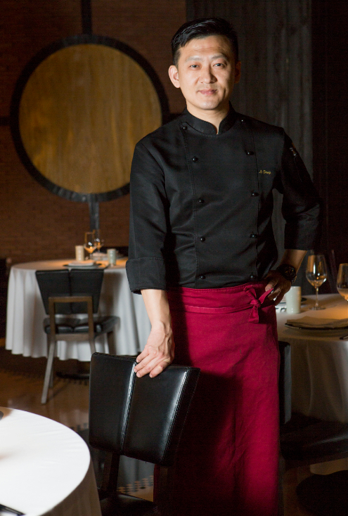 餐厅主打中式戏院风格,主角是“戏院”中心的大型烤鸭炉,客人可以看到烤鸭师傅现场烹饪。李冬的拿手绝活便是北京烤鸭,枣木烤出来的鸭皮入口即化,鸭肉细嫩紧致。在他看来,美味永远在传统与新意之间寻找味道的平衡点。“我在烹制烤鸭时,一方面严格按照老一辈师傅的方法去做,烫皮、打色、吹干抽湿……整整需要三天,之后再烤,才能做到酥脆。虽然烤鸭的预制采用传统技艺,但另一方面又在酱、饼、料上体现创新。”李冬做的烤鸭酱采用独家秘制的配方,研制了三个月,根据鸭肉油腻的特性,调出来的酱能使烤鸭吃起来清爽解腻。