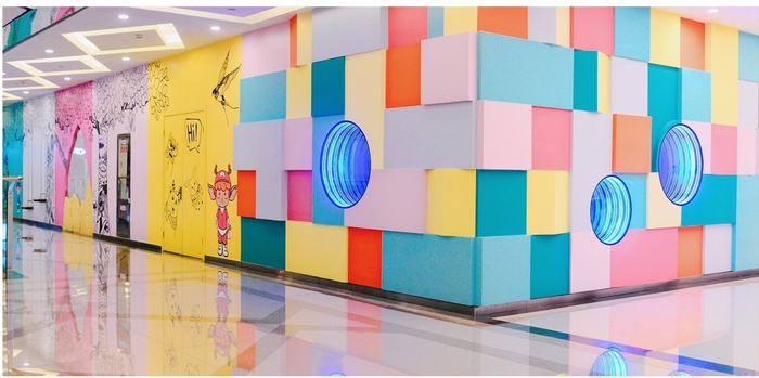 区别于传统动物园,奥摩星球动物乐园开在室内,位于居然之家北五环店的3层。在家居卖场中,它显得独特又有趣。而且在位置方面也占据优势,它的楼下是盒马鲜生,入口还有超级乐高墙和手绘墙。
