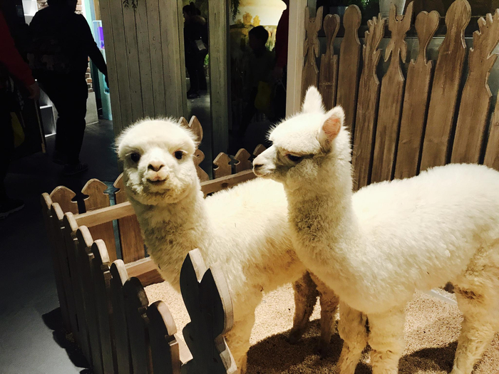 羊驼外形有点像绵羊,性情温驯,伶俐而通人性,受到很多人的欢迎。奥摩星球动物乐园的场馆中也有两只羊驼。它们瞪着一双无辜的眼睛,嘴巴不停地咀嚼着食物,跟随投食的人群挪动步伐,时不时还把耳朵折起来,像只渴望被“撸”的小猫。面对没有食物的观者,它也毫不犹豫地躲开触碰。