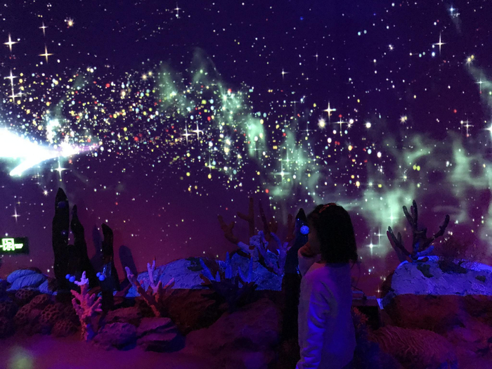 在深海秘境场馆中,奥摩星球动物乐园运用了全息投影技术,鲨鱼、水母等海中生物的画面在屏幕中放映,如同置身蔚蓝的海底。尤其是地面上一触动就会跑掉的海底动物,让人更有一种身临其境之感。