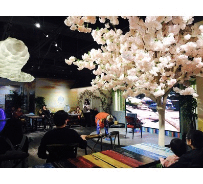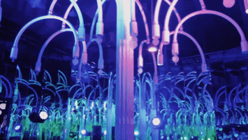 在奇幻之境场馆中,墙面上都是镜子式的玻璃,天花板上悬挂着呼吸灯,拿着它轻轻一吹气,灯便开始一颗一颗变换着颜色,让整个空间亮起彩色。而蒸汽树则制造着从天而降的泡泡,在半空中“爆破”,落下淅淅沥沥的小泡沫,仿若空气中有双无形的手将它一触而破。这样的梦幻场景记录在镜头里,让这个地方成为拍照“圣地”。