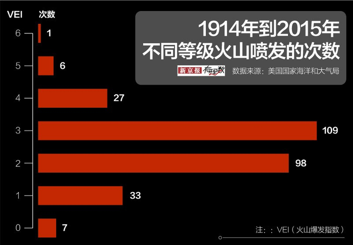 可以看出,近一个世纪以来,2级和3级的火山爆发最为常见。