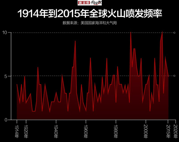 只统计近一个世纪来的全球火山喷发,可以看出火山喷发的频率是很随机的。少则1次,多达10次,全凭脾气。