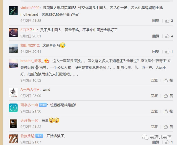 他不但为撑暴纵暴摇旗呐喊,还在网络上恬不知耻的说自己是英国人,并一直为自己是英国人而感到自豪,却全然忘了生父当年抛妻弃子的事,何其讽刺。据称黄秋生已经在英国找到了失散多年的同父异母的两个英国哥哥,并准备正式改名为“佩里”移居英国,黄媒称之为落叶归根,真的让人无语。
