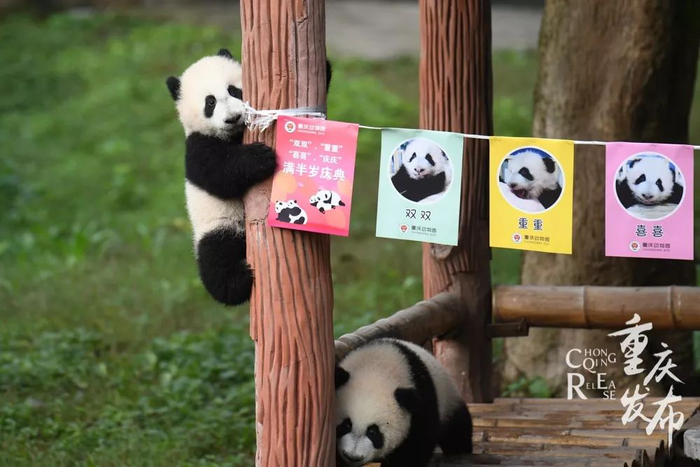 身体长得壮今年6月23日,重庆动物园的大熊猫妈妈“兰香”和“莽仔”在同一天先后产下双胞胎熊猫宝宝——双双、重重、喜喜、庆庆。