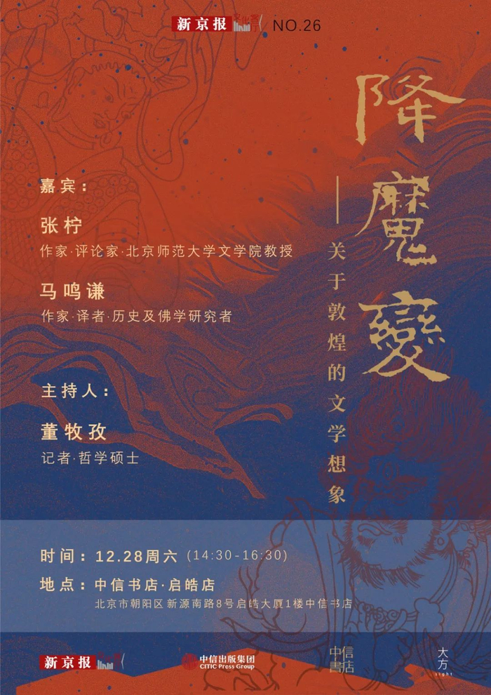 12月28日,新京报·文化客厅第二十六场联合中信出版·大方、中信书店·启皓店,邀请《降魔变》作者马鸣谦、作家张柠,以及主持人书评周刊记者董牧孜,一起聊一聊《降魔变》这部作品对于敦煌历史的文学想象。