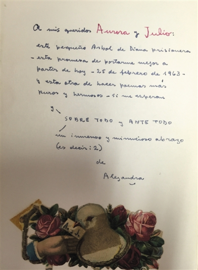 1963年,皮扎尼克在赠予科塔萨尔夫妇的《狄安娜之树》扉页上所写的献词。献词中皮扎尼克说自己“还要写更纯净美好的诗,如果这些诗在等我的话”。