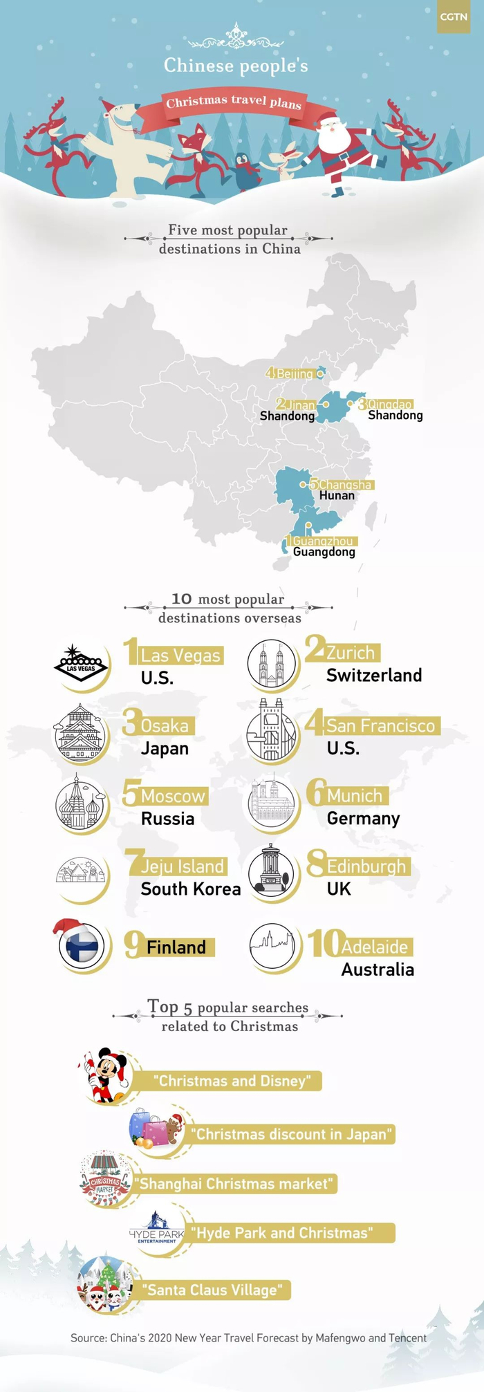 马蜂窝旅游研究中心负责人冯饶总结道,“伴随着人们生活水平提升,中国人愈发关注‘仪式感’。圣诞节和元旦恰逢新旧交替之时,越来越多的人希望用一项具有仪式感的体验,来为一整年画上一个独特而圆满的句号,留下珍贵的回忆。”A travel trend report shows that “Christmas in Guangzhou” was the most searched destination in China, followed by Jinan and Qingdao in east China‘s Shandong Province, Beijing Municipality, and Changsha in central China’s Hunan Province。 It suggests that Christmas-related events are more contemporary and trendy in these cities.The report was issued this month by Mafengwo, a Chinese travel website that allows users to share their travel experiences, along with Tencent。 It analyzed tourist types and their travel plans during Christmas and New Year based on their online searches.Tourists who plan to go abroad for Christmas are more likely to pick European and American attractions。 Among the top 10 most popular overseas destinations, eight are located in Europe and the U.S。, where people expect to experience authentic Christmas culture and atmosphere。 “Las Vegas” was the most searched destination for Christmas。