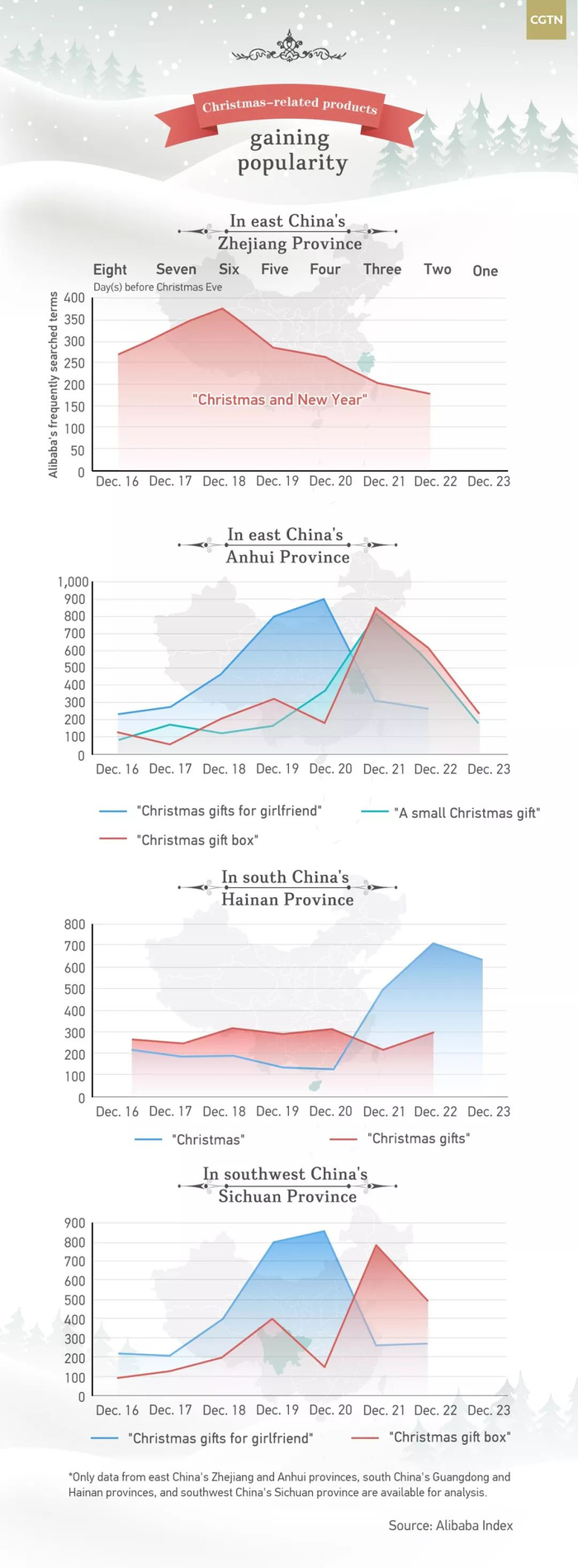 圣诞节临近,大大小小的商家也就顺势推出了五花八门的圣诞产品。淘宝数据分析平台,阿里指数的大数据显示,“圣诞”相关产品的热搜程度自上周开始,在各地都明显上涨。Christians in China account for about 1.8 percent of the total population, according to 2010 Report on Religion in China。 But Christmas celebrations are not confined to just Christians in the country。 Its popularity is inseparable from the festive atmosphere created by big shopping malls.Therefore, some people think that Christmas in China is just commercial.Christmas gifts and Christmas-related products become very marketable during the holiday season。 The trend was reflected by the Alibaba Index, which indicated the search frequency of online buyers on Taobao, a Chinese online shopping website and world‘s biggest e-commerce platform。