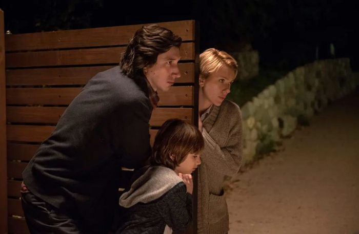 《婚姻故事》剧照。电影结尾,妮可看到抱着他们儿子的查理鞋带松了,便喊住他蹲下身给他系了鞋带,随后轻轻拍了拍查理。