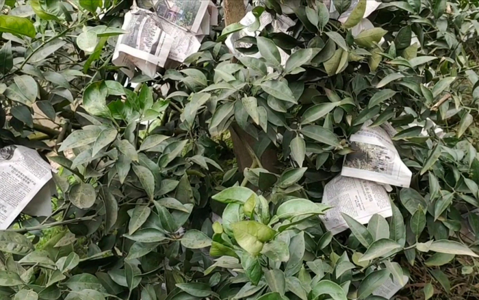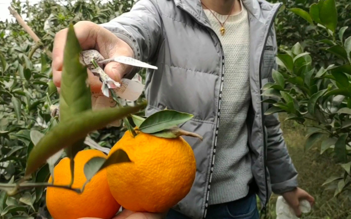 新京报记者在四川眉山市丹棱县龙潭村徐姓农户家的柑橘园看到,柑橘树3到5棵为一组,被罩上了一层塑料膜,树上的果实裹着套袋,套袋的外面还有一层报纸。据徐姓农户介绍,这样做是为了越冬防冻,加盖一层报纸是为了确保套袋外观清洁。记者在现场注意到,果园里种了“爱媛38号”“春见”耙耙柑“不知火”丑橘。“不知火”丑橘的叶片略微卷曲,“春见”耙耙柑的叶片边缘浑圆,不像“不知火”丑橘带有清晰的锯齿。