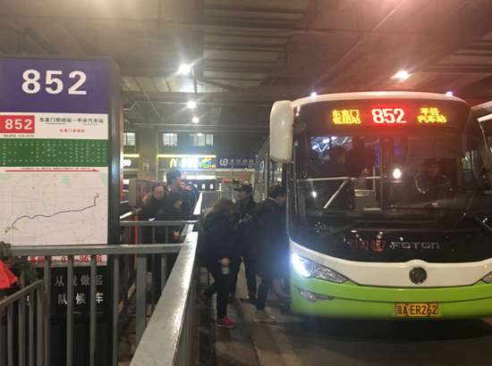 “坐852的乘客,请您排队上车!”周五晚上7点40分,东直门公交枢纽站,前面一辆公交刚刚驶出,下一辆就紧跟着开到了站台。旁边,四五十名等车人正有序地排成一列,一个接一个地登上这班回家的公交。