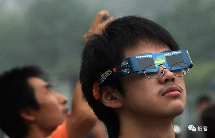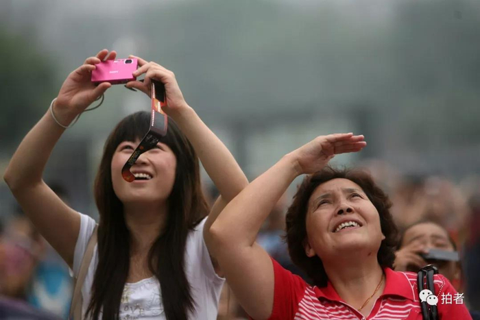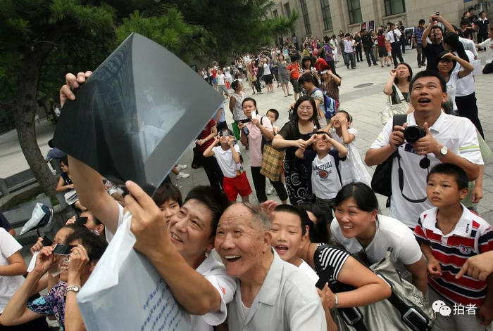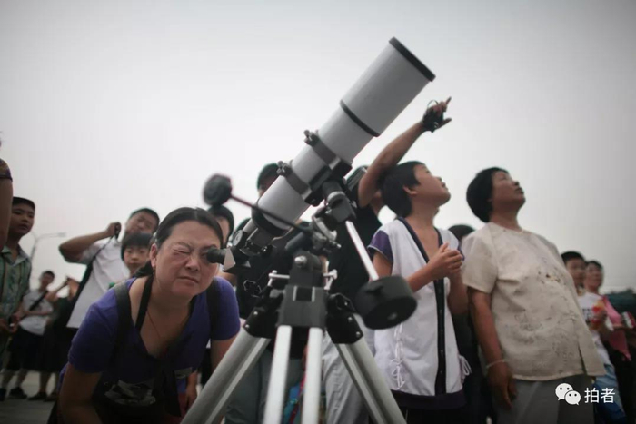 △ 北京,中外观测者一同观看日偏食。摄影/新京报记者王贵彬