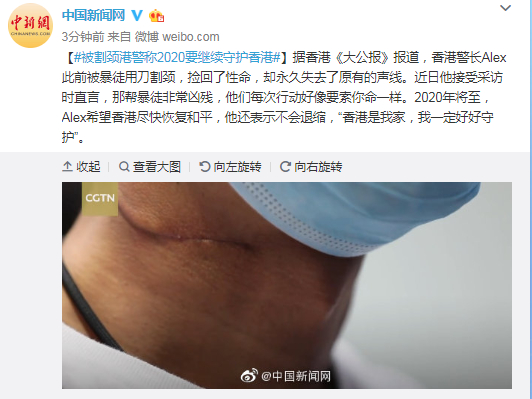 据香港《大公报》报道,香港警长Alex此前被暴徒用刀割颈,捡回了性命,却永久失去了原有的声线。近日他接受采访时直言,那帮暴徒非常凶残,他们每次行动好像要索你命一样。2020年将至,Alex希望香港尽快恢复和平,他还表示不会退缩,“香港是我家,我一定好好守护”。
