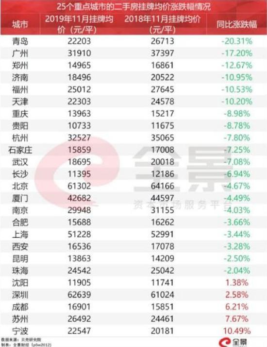 最近,网络上流传着这样一张图片,图表显示,2019年11月,25个重点城市的二手房挂牌均价中,有20个下跌,下跌最厉害的青岛,降幅高达20.31%!