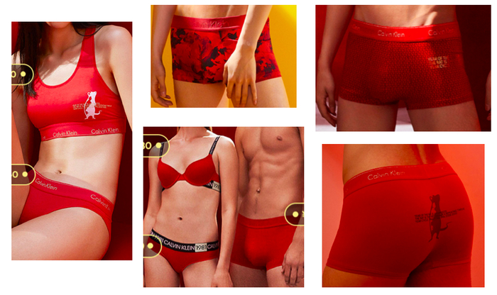 内衣以红色为主色调,搭配黑色或金色,图案包括趣味老鼠、水墨印花、“CALVIN KLEIN”或“2020”字样印花,款式多样。