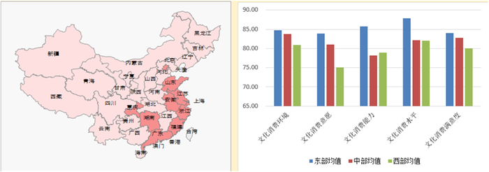 左图为2019文化消费指数前十名,右图为2019东中西部地区文化消费指数。