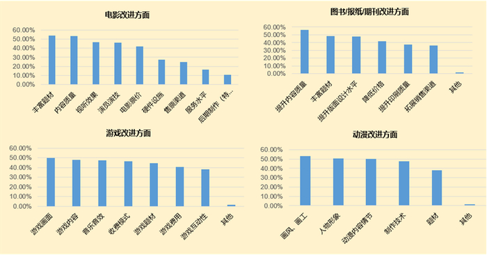 那么,受访者又希望文化产品做出哪些改进呢?曾繁文表示,根据反馈信息可以得出这样的结论:受访者普遍希望优化文化产品的内容和质量,提升表现力,比如大家期望可以丰富电影的题材并对内容质量进行提升,希望可以改进游戏画面等,对动漫产品的画风、画工的提升也很期待。