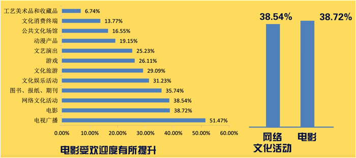 调查数据显示,居民消费支出最大的五个文化产品或服务依次是:文化旅游,游戏,网络文化活动,电影,文艺演出;市场成长空间最大的五个文化产品或服务依次是:网络文化活动,游戏,文化旅游,电影,文化娱乐活动。