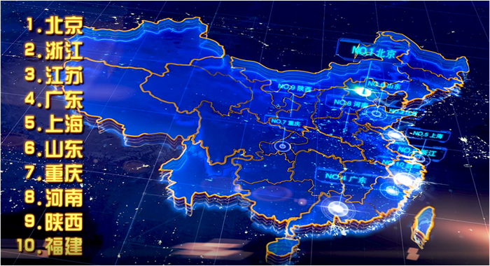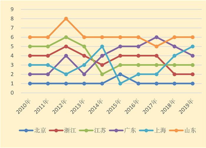 近十年均位居前十的省份包括北京、浙江、江苏、广东、上海和山东。