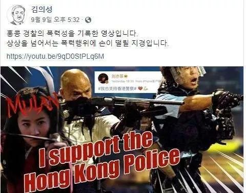 9月9日,金义圣在社交媒体上转载“港警暴力镇压示威群众”以及“中国明星力挺港警”的视频,导致原本在韩国形象良好的刘亦菲(宋承宪的前女友),也跟着遭到一些非议。