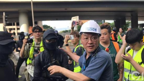 在现实中,他也不遑多让。风波期间,他带了一支摄影队,加入暴徒队伍,给他们加油打气,他参与了英国领事馆门前的示威,采访了多名反对派议员、大学生以及自称是“元朗事件”的被害者的人,给他们“控诉”警方“暴力”提供舆论出口。在街头全副武装的“黑衣人”身边,金义圣对着镜头说,这场面“令他感动”。