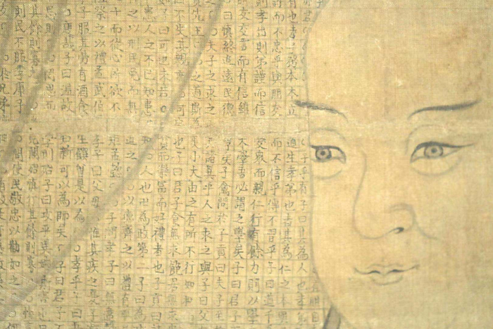 明代《孔子、颜回、曾参三圣图轴》,孔子博物馆藏,衣纹衣褶书小楷,全部为《论语》章句。摄影/新京报记者 浦峰