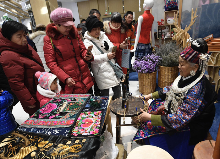 现场展示苗族手工苗绣。摄影/新京报记者 吴宁