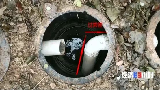 记者发现,第二只桶和第三只桶之间的过粪管是从下往上斜着安装的,这个桶里粪便装满了以后,要排到右边的桶里,就必须沿着过粪管,先从下往上走,再横着排到右边的桶里,收集粪便的塑料桶不仅过粪管道设计不合理,第一只桶还被压在了厕所房子下面。