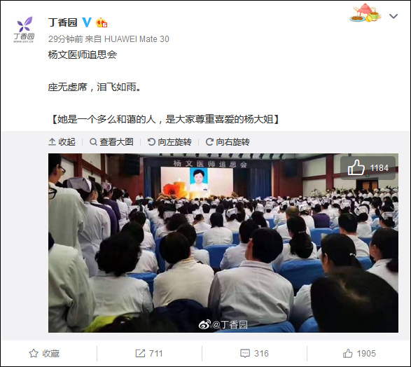 在追思会上,杨文同志生前同事、领导与大家共同追忆杨文同志。大家纷纷表示,杨文同志珍爱医生职业,在急诊岗位工作22年,成功医治无数病患,是大家尊重喜爱的“杨大夫”“杨大姐”,对她的不幸遇害表示痛心和哀悼。大家纷纷对杀人凶手漠视生命、残忍施暴的罪恶行径表示愤怒谴责,强烈要求司法机关依法进行严惩。广大医护人员表示,一定发扬大爱无疆、仁医仁德的人道主义精神,化悲痛为力量,坚守岗位,无私奉献,为消除更多患者的病痛而努力工作。