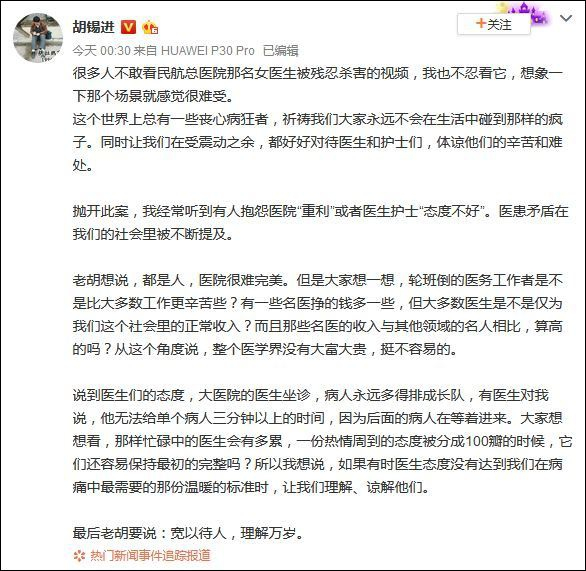 《环球时报》总编辑胡锡进发微博表示,他和很多人一样不忍看这视频,并说,“这个世界上总有一些丧心病狂者,祈祷我们大家永远不会在生活中碰到那样的疯子。同时让我们在受震动之余,都好好对待医生和护士们,体谅他们的辛苦和难处。”
