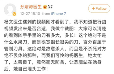 视频画面十分残忍,孙文斌是从杨文身后将其刺死。一位120急救医生向公众号“医学界”描述了他看完视频后的感受:“他掏出刀的那一刻,真令人胆战心惊,不寒而栗。手段简直太残暴了,直接背后抹脖子,真的让人上班时后背发凉。这是我见过的最残暴的杀医,就是奔着杀人去的,捅心脏都有救活的希望。”