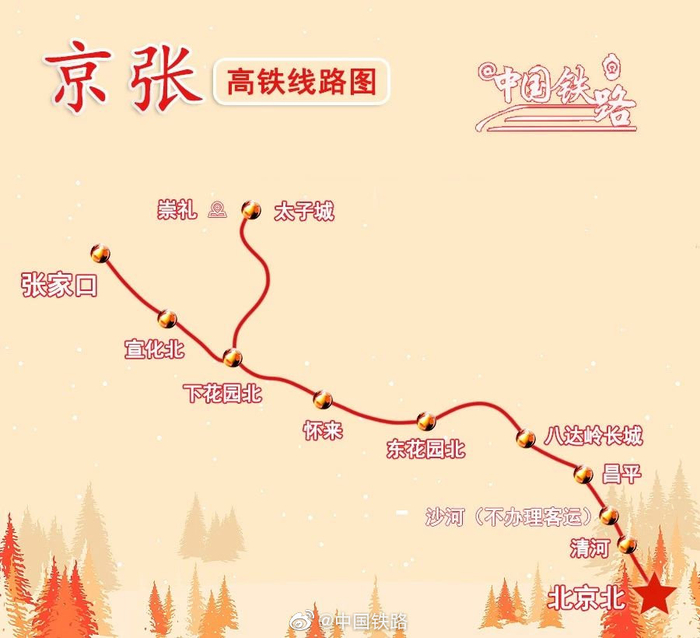 京张高铁从北京枢纽北京北站引出,经北京市昌平区、延庆区,至河北省张家口市怀来县、下花园区、宣化区、桥东区,线路全长174公里,最高设计时速350公里,全线设北京北、清河、沙河(不办理客运)、昌平、八达岭长城、东花园北、怀来、下花园北、宣化北、张家口10座车站。