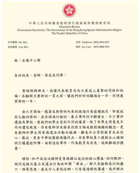 专访前夕,杨润雄又向全港中小学师生及家长发出一封公开信,呼吁理性、和平及法治精神,提醒学生“学校是学习的园地,而不是政治角力的场所”“做事三思而后行,不要被看似高尚的理念所误导”, 强调将严肃跟进涉及教师失德或违法行为——这已是他一周内发出的第三封公开信。