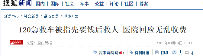 大约9年前,国内曾发生过“120急救车被指先要钱后救人”的新闻。