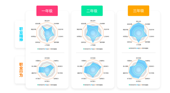登录“北京职业素养”微信平台,输入个人信息,就能看到个人在各个模块的成长情况。“素养雷达这一部分,会呈现每个人的行为指标、精神指标数据。比如我的’几何图形’会告诉我在艺术审美这块有短板,我就会通过参与活动等提升这部分能力。”北京市商业学校17级小学教育贯通班吴佳琦说。