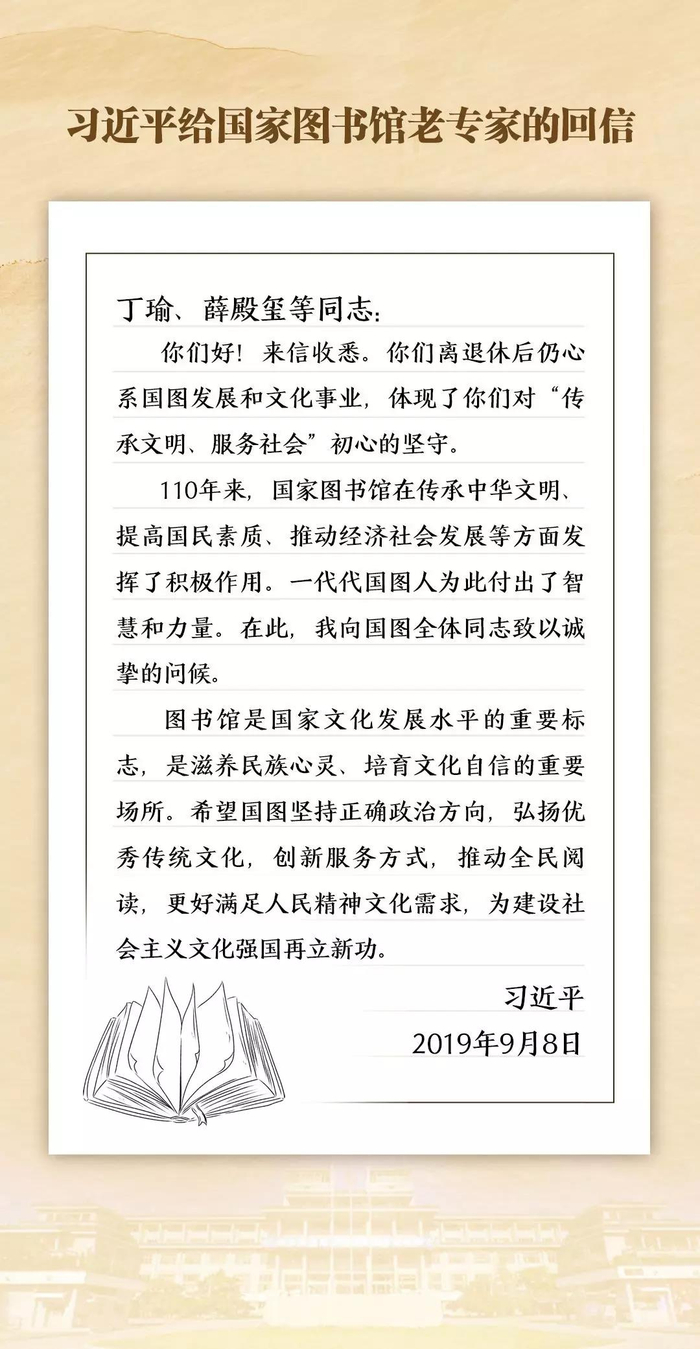 在国家图书馆建馆110周年之际,习近平总书记给国家图书馆8位老专家回信,希望国家图书馆坚持正确政治方向,弘扬优秀传统文化,创新服务方式,推动全民阅读,更好满足人民精神文化需求,为建设社会主义文化强国再立新功。