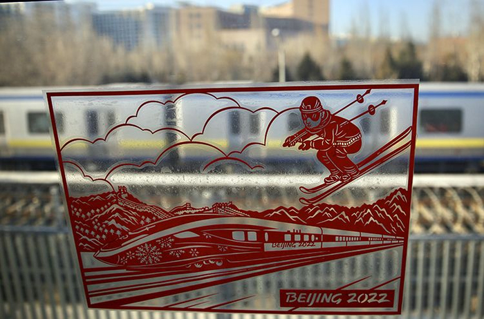 车窗上贴着冬奥主题的蔚县剪纸。