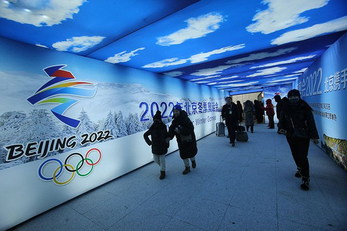 太子城站出站口,乘客走过2022北京冬奥会主题长廊。