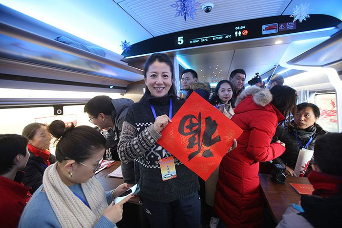 中国冬奥首金得主、北京冬奥组委运动员委员会主席杨扬受邀乘坐了首趟列车。
