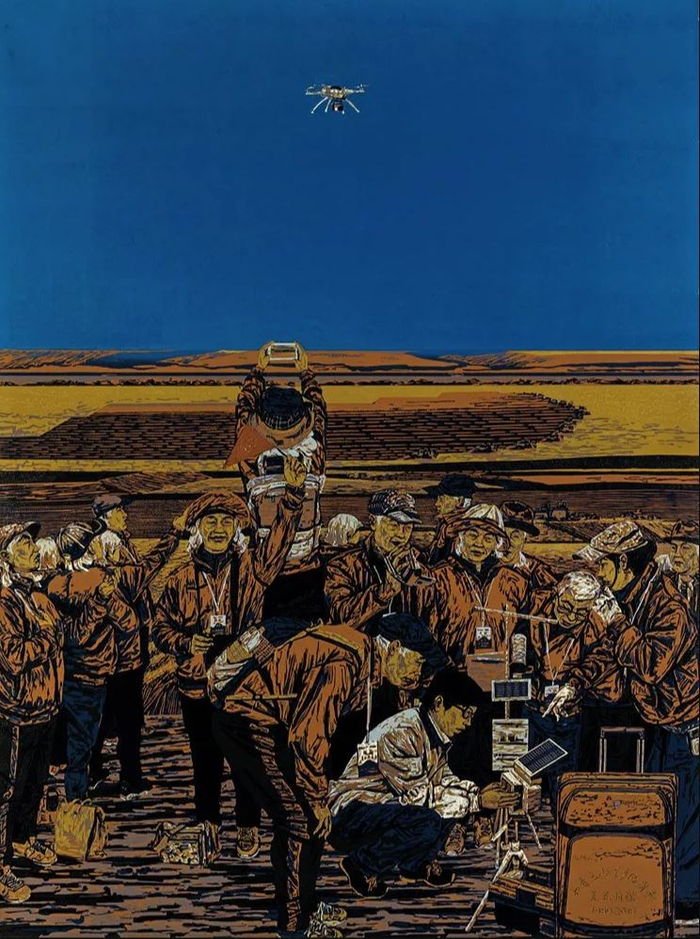 版画《金秋时代》也是金奖作品,它敏锐地捕捉到高新技术运用到北大荒智慧农业的现实场景。画面以北大荒宁静湛蓝的天空为远景,大面积金黄色的庄稼使丰收的气息一展无遗。一群北大荒早期开拓建设者组成的返乡参观团漫步智慧农田,成排的先进数字化农机纵横大地,他们细致地观察着数字化农田管理装置,倾听讲解、拍照留念。画面正上方是蓝天映衬下的无人机,这个凸显的视觉标志,起到了连接历史、定格当下、预见未来的符号学作用。作者沙永汇采用了层次鲜明的平面化造型语言,布局得当的色块与干脆利落的木刻刀法形成一股合力,使得作品给人一种饱满、生动的艺术气息。