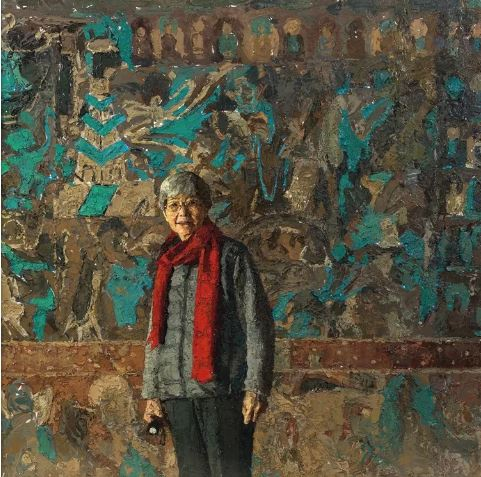 油画《敦煌女儿》描绘了敦煌研究院前院长樊锦诗的形象,歌颂了当代中国知识分子为国家、为人民无怨无悔奉献青春年华的精神。作者袁元在构图上把樊锦诗置于《舍身饲虎》这幅敦煌壁画前,寓意她舍身忘我地投入到敦煌研究和保护事业中,画面刻意运用更硬朗、更有力量感的表现手法来突出描绘樊锦诗的精神强度和她瘦弱身躯之间的强烈对比,同时尝试运用油画刀带来的抹、刮、擦等技法形成的表面肌理,来契合壁画特有的斑驳效果,力图使人物形象融入壁画大环境之中,是一幅内涵丰富的肖像作品,获得了银奖。